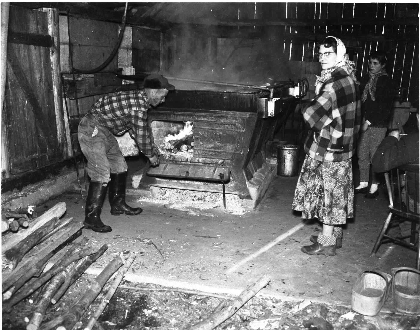Photos from the sugar bush of Hormidas Laurin at the bottom of the 18th Concession of Tiny Twp. The camp was visited on a Sunday morning by Vern Farrow, Free Press editor in Penetang, and his wife, on the invitation of Mr. Laurin’s nephew Marcel Bellehumeur. [The Penetang Free Press office was in the same building on Robert St. W. as M. Bellehumeur’s insurance office.]