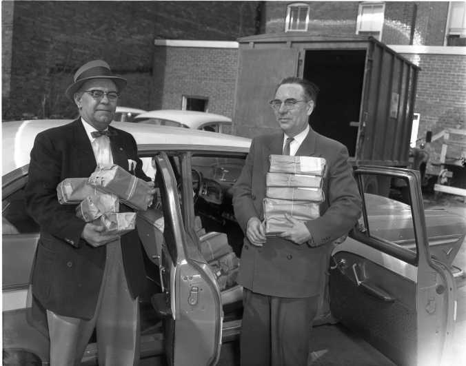 Promotion literature by the tens of thousands is distributed annually through the Midland Chamber of Commerce. Dispatching another load are Walter Woods, left, tourist committee chairman; and secretary-manager R. B. Moffatt.
