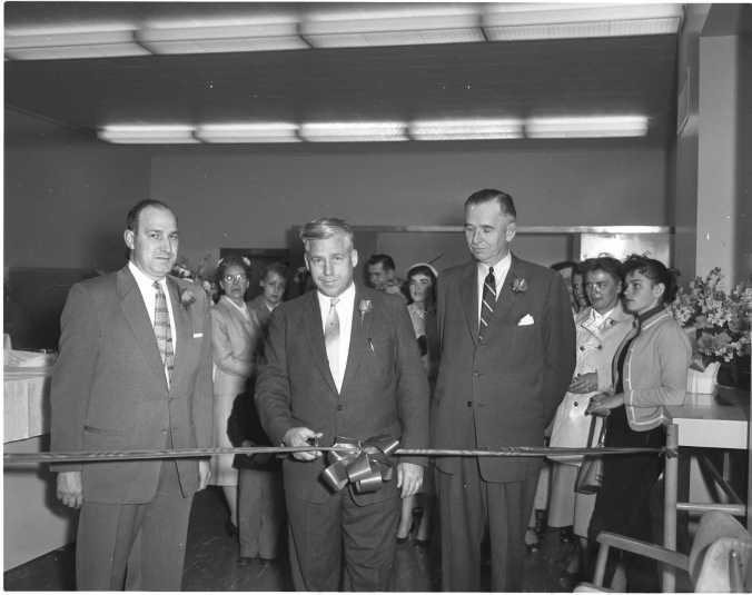 A big moment at the official opening ceremonies at the new Midland branch of the Toronto Dominion Bank came as Mayor Charles Parker cut the red ribbon to admit visitors on a tour of inspection. With Mayor Parker, center, are Norman Shill, manager, left, and Frank F. Hull, the assistant general manager from the bank’s Toronto head office.
