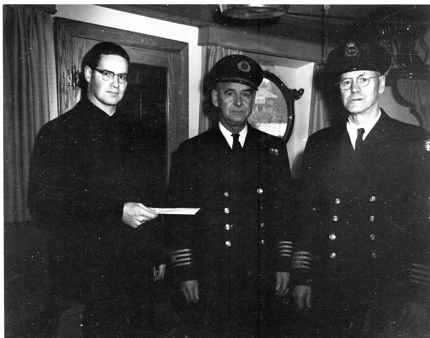 Two veteran sailors, Captain C. C. Chattenburgh, center, and Chief Engineer Mel Leatherdale, right, were aboard the bulk freighter Gordon C. Leitch when the 1958 navigation season opened in Midland last week. On hand to greet them was Bill Russell, left. Mr. Leatherdale has been a Midland resident since 1913, and the Gordon C. Leitch was one of the last ships built at Midland Shipyards.