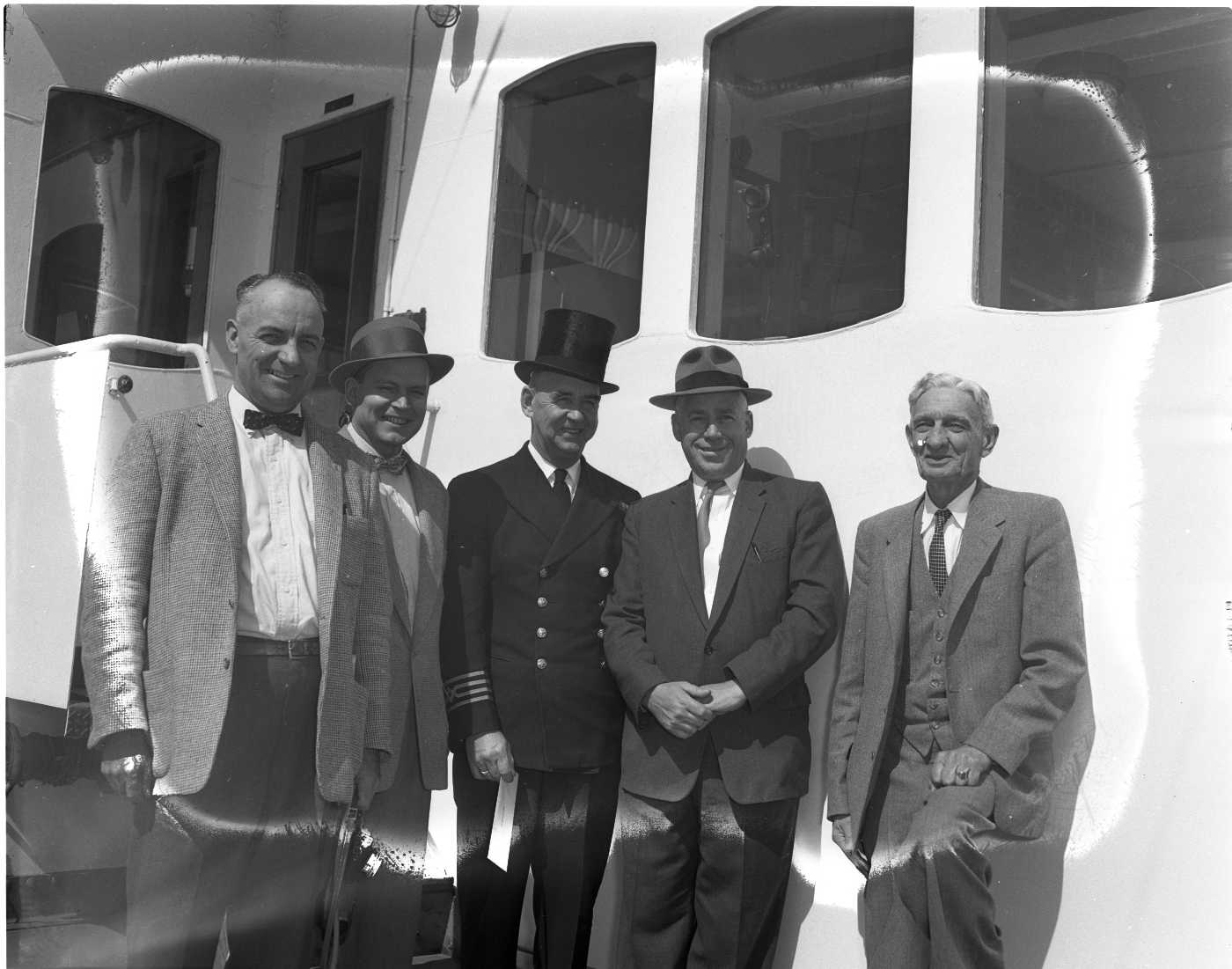 Business is booming again at the port of Midland, as shown by the happy smiles of these men at the “topping” ceremony Monday, April 21 aboard the Gordon C. Leitch, the first arrival of the season. From left to right are CPR agent Harvey White, Chamber of Commerce president Frank Bray, Capt. Clyde Chattenburgh, Mayor Charles Parker, and M. E. Tully, superintendent of the Midland-Simcoe Elevator.