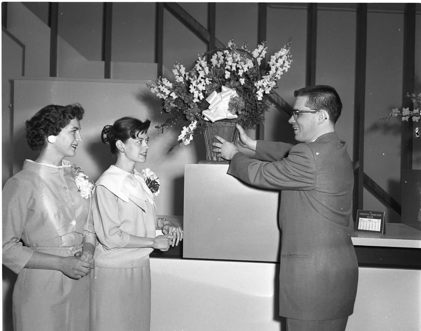 This week, the three young staff members of the new Midland branch of the Toronto-Dominion Bank are engaged in such mundane things as handling money and cheques. Saturday they were seen arranging flowers for the official opening ceremonies. Left to right are Kay Doherty, Leah Dwinnell and Ed Gamna, teller accountant, all of Midland.
