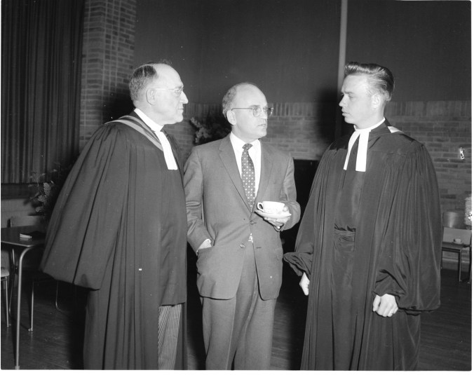 Pictured at a reception held Sunday at St. Paul’s United Church, Midland, for newly-ordained Rev. Bob Jackson, right, are Rev. W. R. Auld; left, and former Midlander Alex Docherty, center. Mr. Jackson was ordained in Toronto June 1.