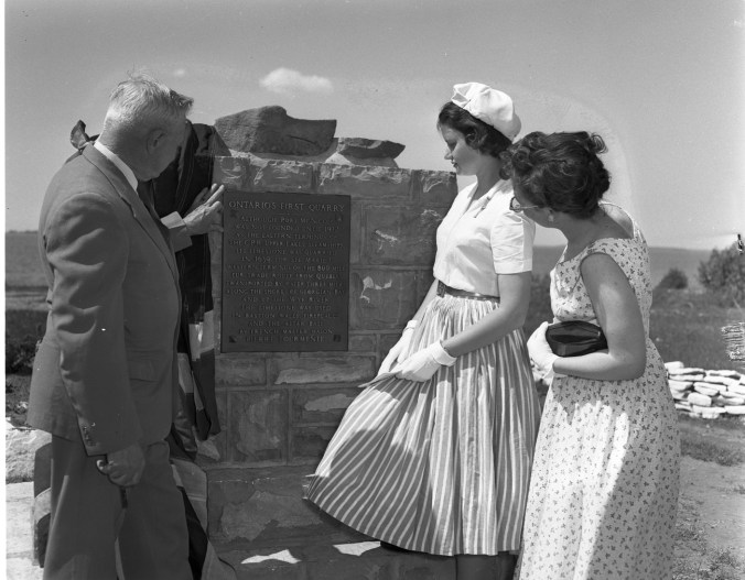Site of Ontario’s first stone quarry, near Port McNicoll, has now been marked by a cairn and plaque. Dr. Wilfrid Jury, noted archaeologist, left, explains the significance of the site to Marjorie Johnston of Brantford and Elizabeth Scantlebury, Toronto. Cairn was unveiled at ceremonies Saturday.