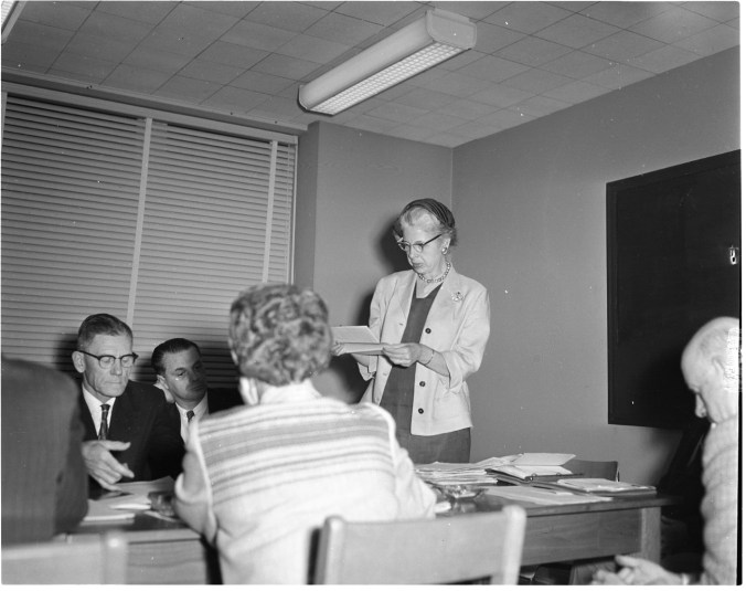 These women from Sturgeon Bay were among many groups of visitors who visited the new Odd Fellows’ Hall in Midland at its official opening Friday. Seated, left to right, around the table are Mrs. Gilbert Ball, Mrs. W. Wilson, Miss Joyce Ball, Mrs. John Todd and Mrs. T. Duffy. Mrs. William Baker is serving.