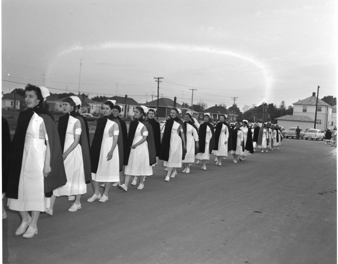 Royal Victoria Hospital in Barrie graduated 26 nurses last week; six from North Simcoe. Here nurses are seen approaching Barrie District North Collegiate, where graduation exercises were held.