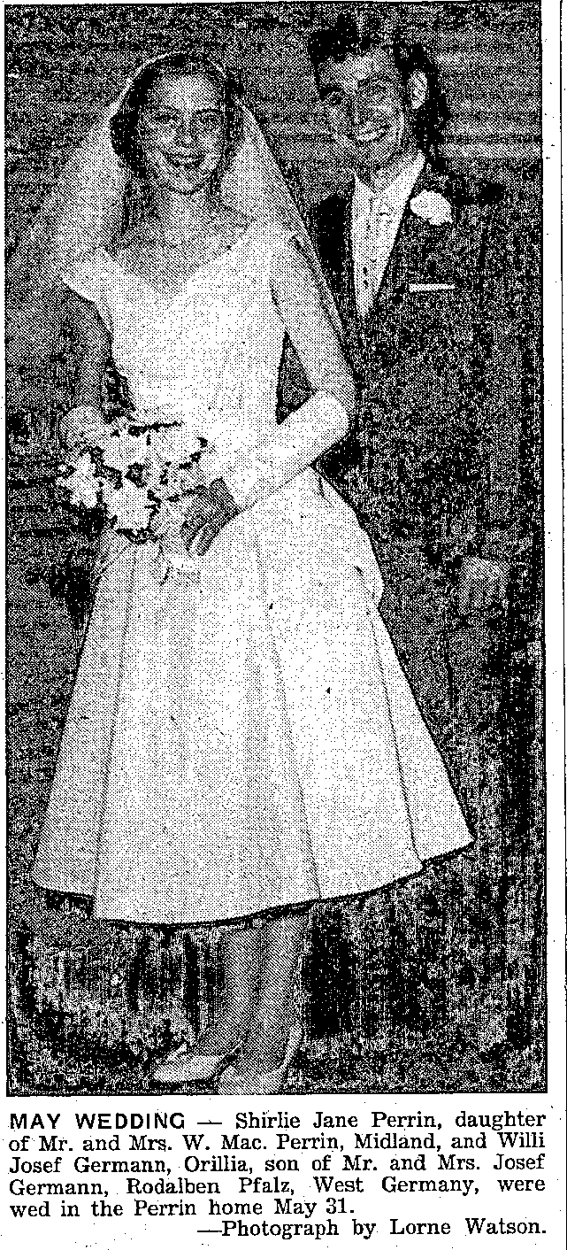 Article by Mrs. Victor Hall – Truth is stranger than fiction, they say. Let me tell you a little human interest story to prove this. It began in merry old England some 80 odd years ago when a blushing young bride took her marriage vows and a new family was established. This couple was blessed with four sons and five daughters. But when the father was still a young man in his forties, tragedy struck the little family. The husband died and his widow was left to struggle to support her growing family, the youngest of which was still a babe in arms. After much heartache and sorrow, the mother decided she would have to give up two of her children. She could take them to Dr. Bernardo’s Home in London. But how could she? Which ones would it be? The older ones could help a little. The two youngest girls were just babies. She would have to keep them with her. Finally, she made her decision. She would take the boy, William, aged seven, and the girl Ann (named after herself); aged five, to the home. They would receive care and perhaps a good foster home. Christmas Eve found the little group, mother, Will, and Ann on the doorstep of the great Barnardo Home in London. With tears streaming down her face and trembling hand the mother reached for the door knocker. The brothers and sisters were separated. A new life began for each of them. In a few years, Will was sent to Canada to a little country place (Allenwood) in Simcoe County. From there he went to Wyevale. One day he heard that a girl named Ann Goldsmith had come from England to Vasey. On the chance that it might be his sister Will took a bicycle and set out for Vasey. It was indeed his sister Ann. Later she went to Wyevale. Will went overseas with the Canadian Army in World War I. Ann married and went to a homestead in Saskatchewan. After the war Will returned to Wyevale, married and raised a family of two boys and two girls. Ann raised a family of three boys and seven girls. Her husband died following a car accident at Chilliwack, B.C., where they were holidaying. In the spring of this year, Will’s wife decided she would try to find out something about the rest of her husband’s family. After several letters of inquiry to the home and to people of Brighton (his birthplace), letters started coming to their Midland home. They had found their family. A brother and sister had died; a brother is in New Zealand, and another brother and three sisters live in Brighton. The brother still lives in the old home where the mother died in 1933, never having heard again of Will and Ann. Ann came to Midland from Saskatchewan. On Monday, June 9, Will, his wife and his sister Ann, took off from Malton airport for Croydon Airport, London, to see their newly discovered family. This boy and girl, as many in this district will know, are William Goldsmith, and his sister, Ann (Mrs. Charles Hall) of Lucky Lake, Saskatchewan. The Parnell family was the family with whom Will stayed at Wyevale and the Roebuck family raised Ann.