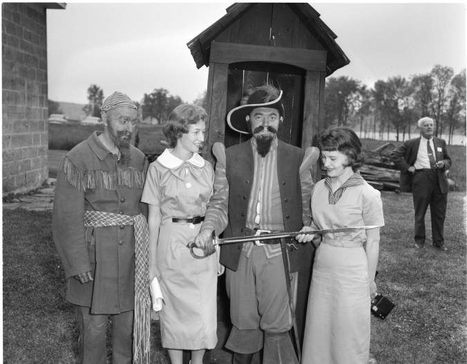 President of the Ontario Historical Society, which held its convention at Midland last week, Miss Lillian -Benson of London took great interest in some of the costumes produced for the official opening of Penetang museum for the new season. Left to right are Miss Annette Brunelle, Donald Lavigne, Mrs. Benson, Miss Barbara Mead and Mrs. George Bryant.