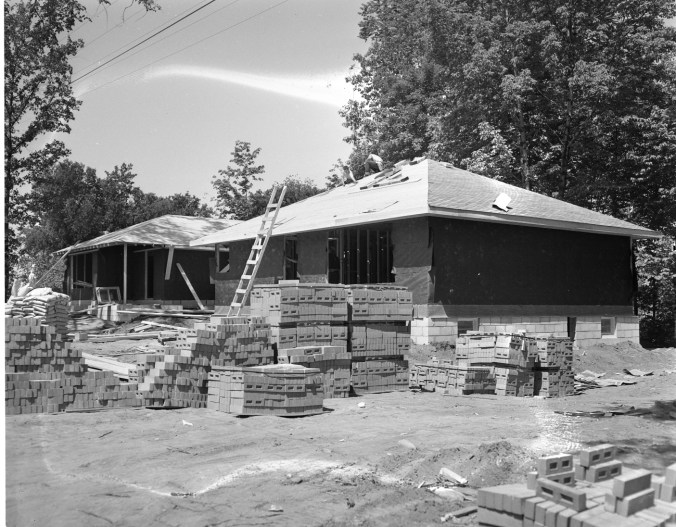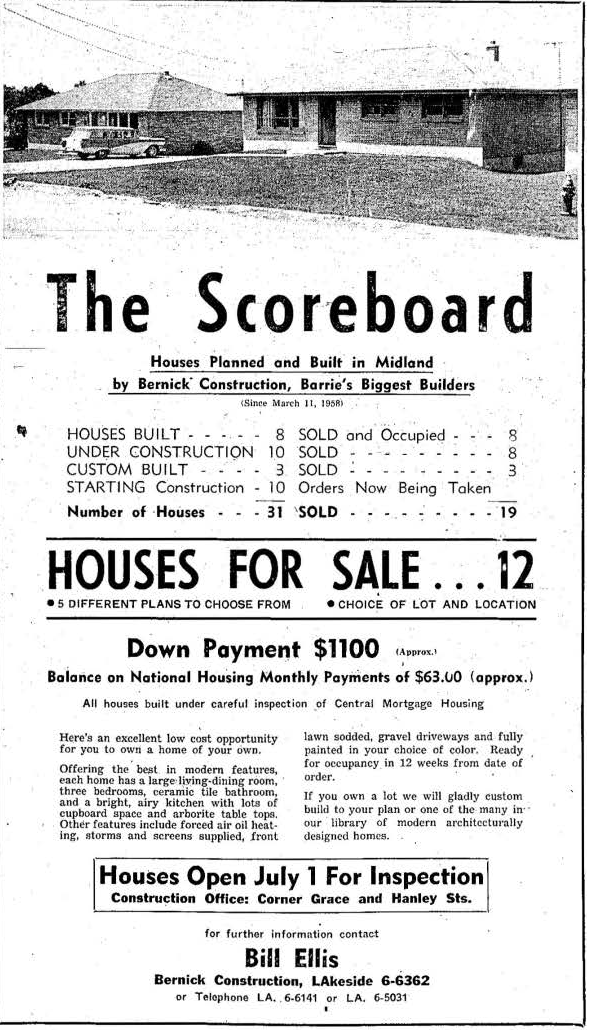 Recession or no recession, there seems to be little letup in the building of new houses in Midland. Among the most active builders is Henry Bernick of Barrie, former Midland industrialist. The top picture shows two new houses under construction on John Street. The lower photo shows two more in a nearly finished state on Donalda Street.