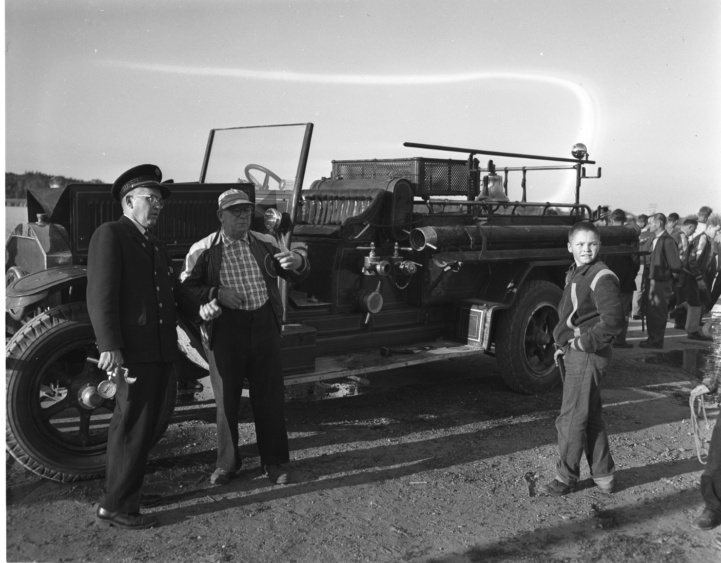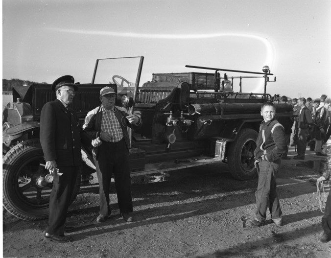 Co-ordinator for Simcoe County’s mutual aid fire program, Barrie Fire Chief R. H. Irwin, is seen chatting with a member of the Waubaushene brigade during a demonstration in that village last Wednesday night. Chief Irwin said the mutual aid program is “working out splendidly,” with more than 300 volunteer and 25 permanent firemen available to combat major emergencies that might arise within the county.