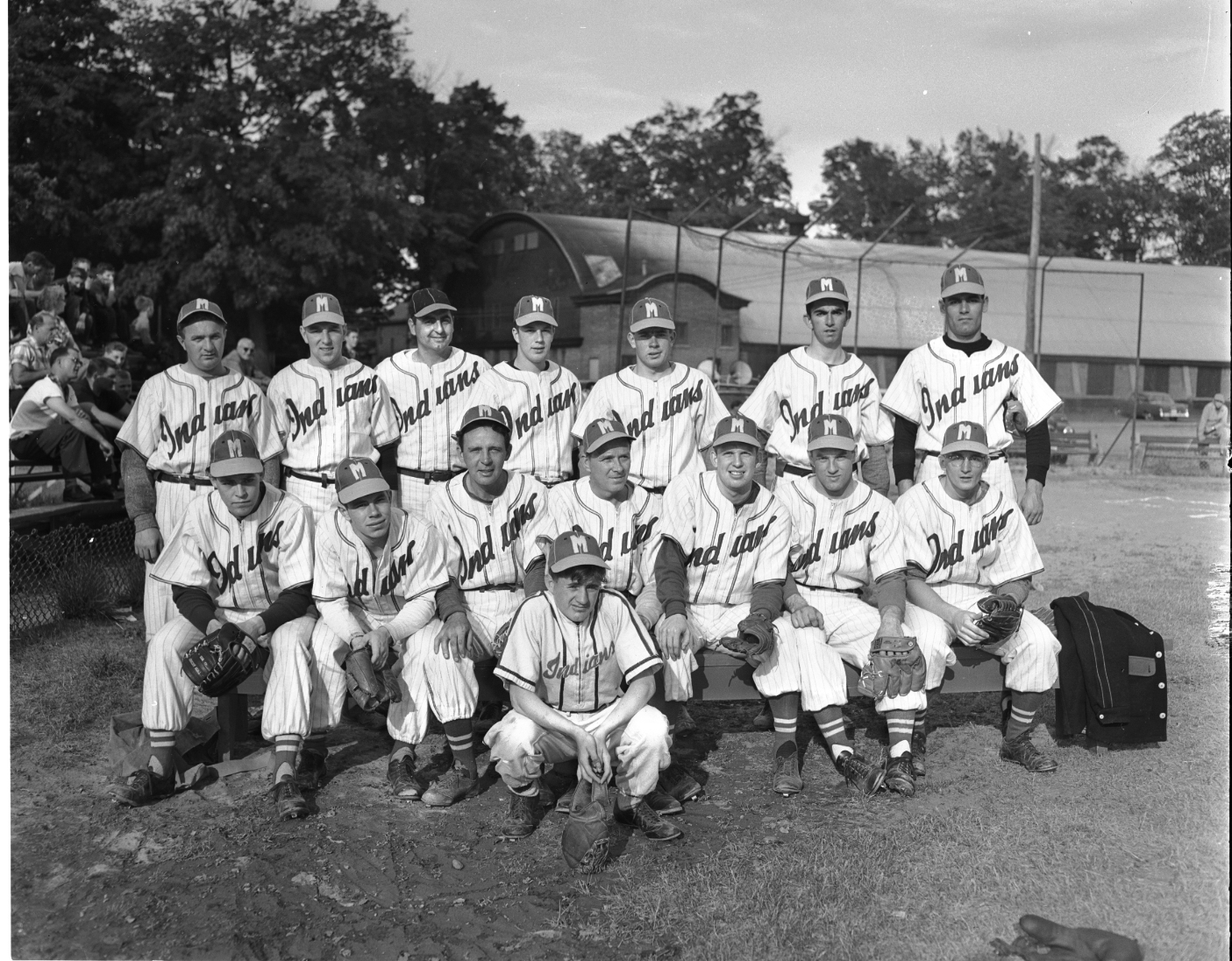 All dressed up in new uniforms, Midland Indians still have plenty of places to go despite their first defeat of the Bruce Baseball League season Monday night. Left to right are, front row – Ab Stainton, Bob Hendrickson, “Buck” Rodgers, coach “Bun” Deschamp, Paul Creighton, Larry Greene, Bill Kettle; back row-Harold Jackson, Murray Yorke, Vic Valentine, Jack Hendrickson, Jim Wilcox, Joe Faragher, Jim Lemieux. In front is bat boy Fred Jackson. Catcher “Buzz” Deschamp was missing when the picture was taken.