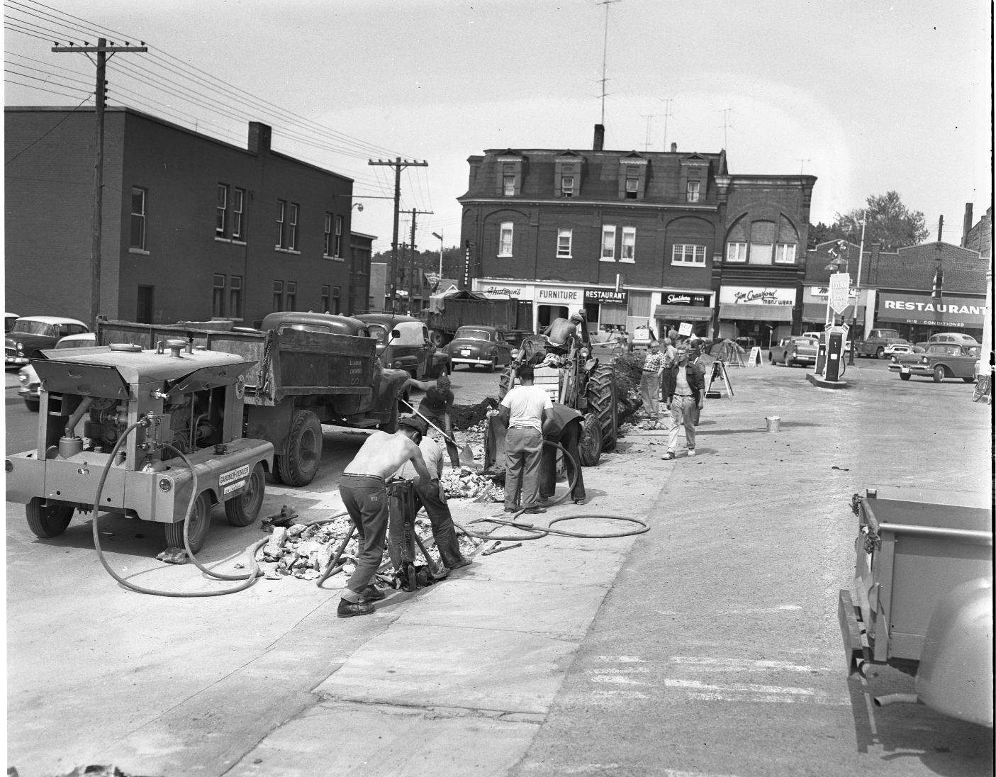 Production line techniques were implemented by Mid-Canada Contractors Ltd. crews as they commenced the installation of gas mains in Midland and Penetang Tuesday. The picture shows some of the crew at work on Bay Street W., Midland. About 25 local men are employed at present. It is expected this will be increased to 40.