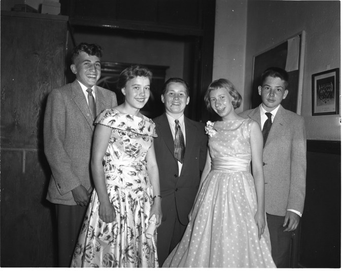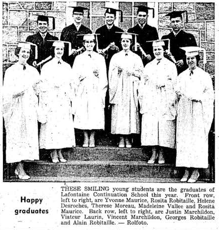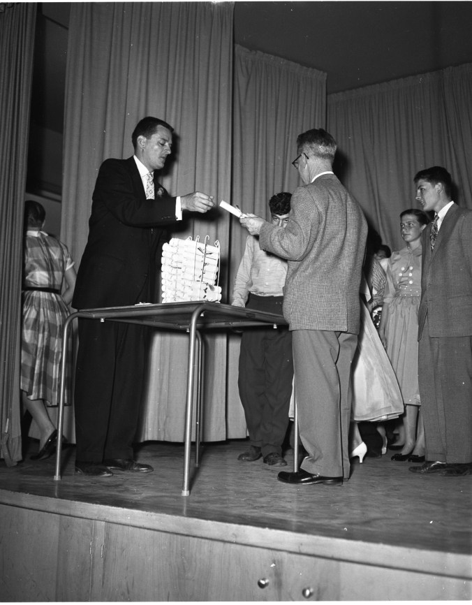 A typical scene at graduation exercises for Grade 8 pupils of Midland public schools Tuesday night includes Wm. Barnett, left, and schools board representative Frank Whiteman, right, handing out diplomas.