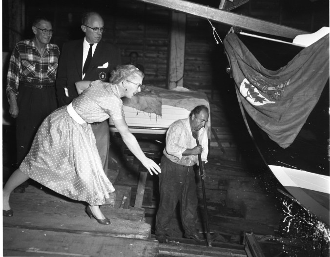 Champagne flew high and wide as Mrs. Ken Wells (Lucille Oille) christened the “Sea Owl” at launching ceremonies in Midland Wednesday afternoon. Onlookers in the background are Len Cowdrey of Midland Boat Works and Ken Wells, journalist and author.