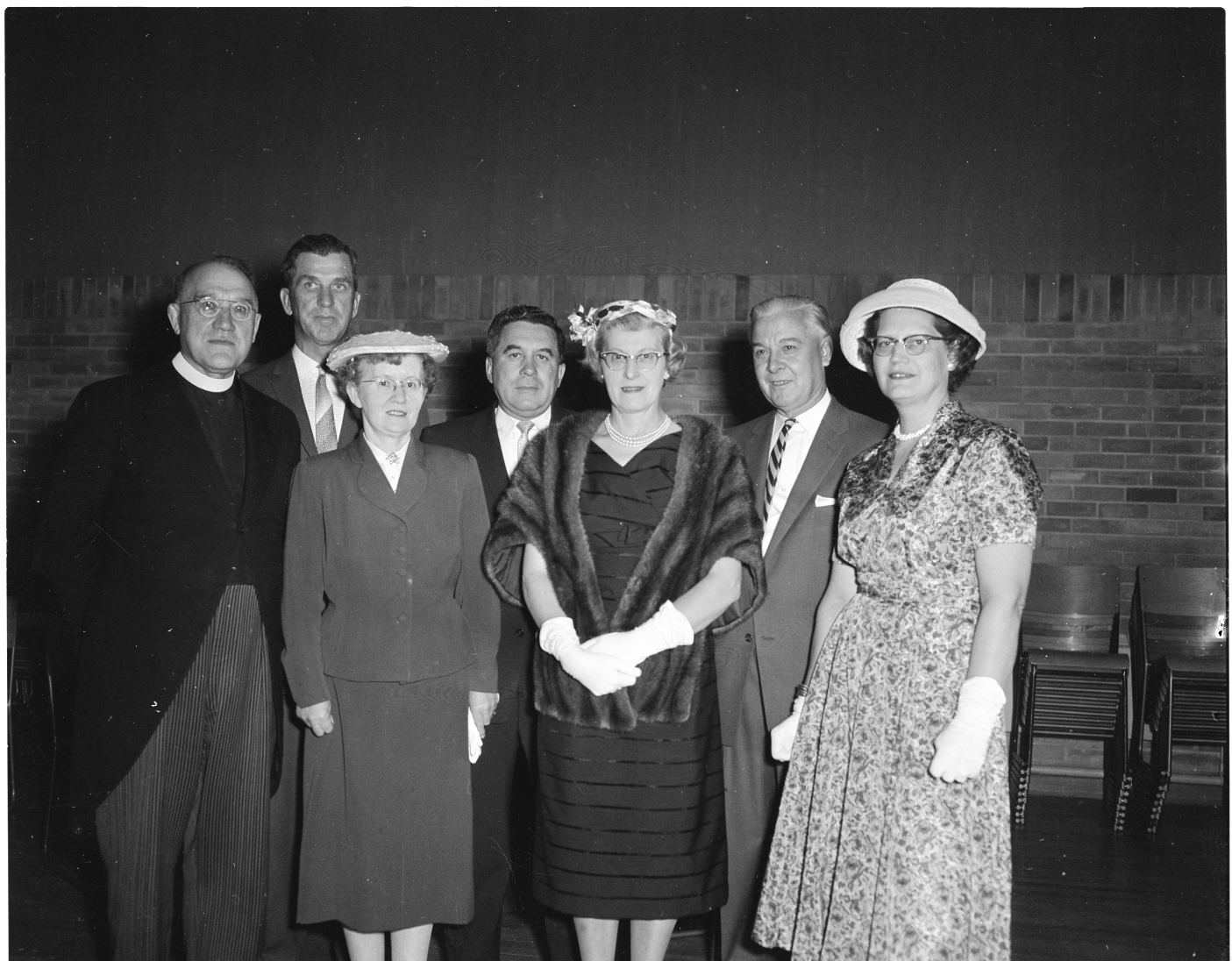 The congregation of St. Paul’s United Church was “at home” to citizens of Midland and district Sunday afternoon, at a reception to honor its retiring minister, Rev. W. R. Auld. Receiving guests, left to right, Rev. Auld, clerk of session J. W. Smith and Mrs. Smith, recording secretary of the board Clarke Edwards, Mrs. McCullough and T. M. McCullough, chairman of the committee of stewards and Mrs. Edwards.
