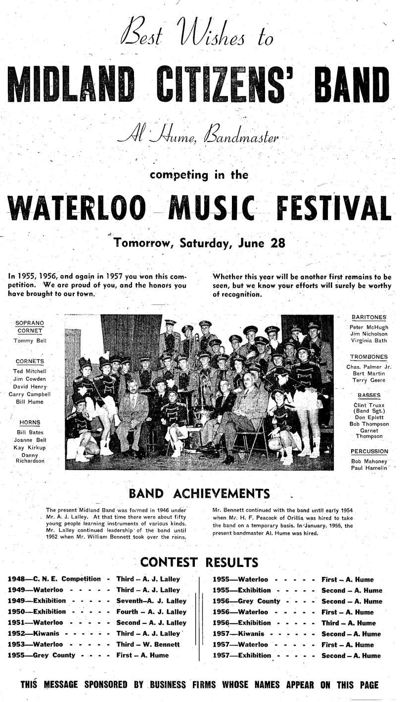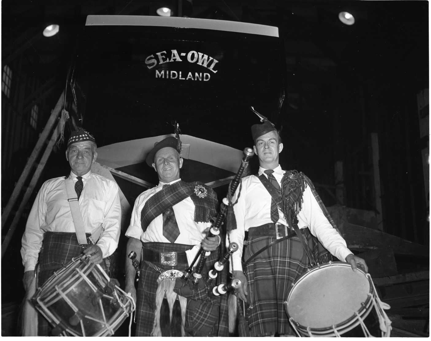 Wet, gray skies attended the launching of the “Sea Owl” in Midland harbour Wednesday. Completed by Midland Boat Works the Sea Owl is the craft in which Mr. and Mrs. Kenneth Wells will soon begin a tour or the Trent Valley waterway system. The launch coincides with the release of Mr. Wells’ latest book, “Cruising on Georgian Bay”. The book was the result of a 1,000-mile journey through the Georgian Bay and along the eastern shore of Lake Huron last summer. (The museum would appreciate the names of the pipers in these photos.)