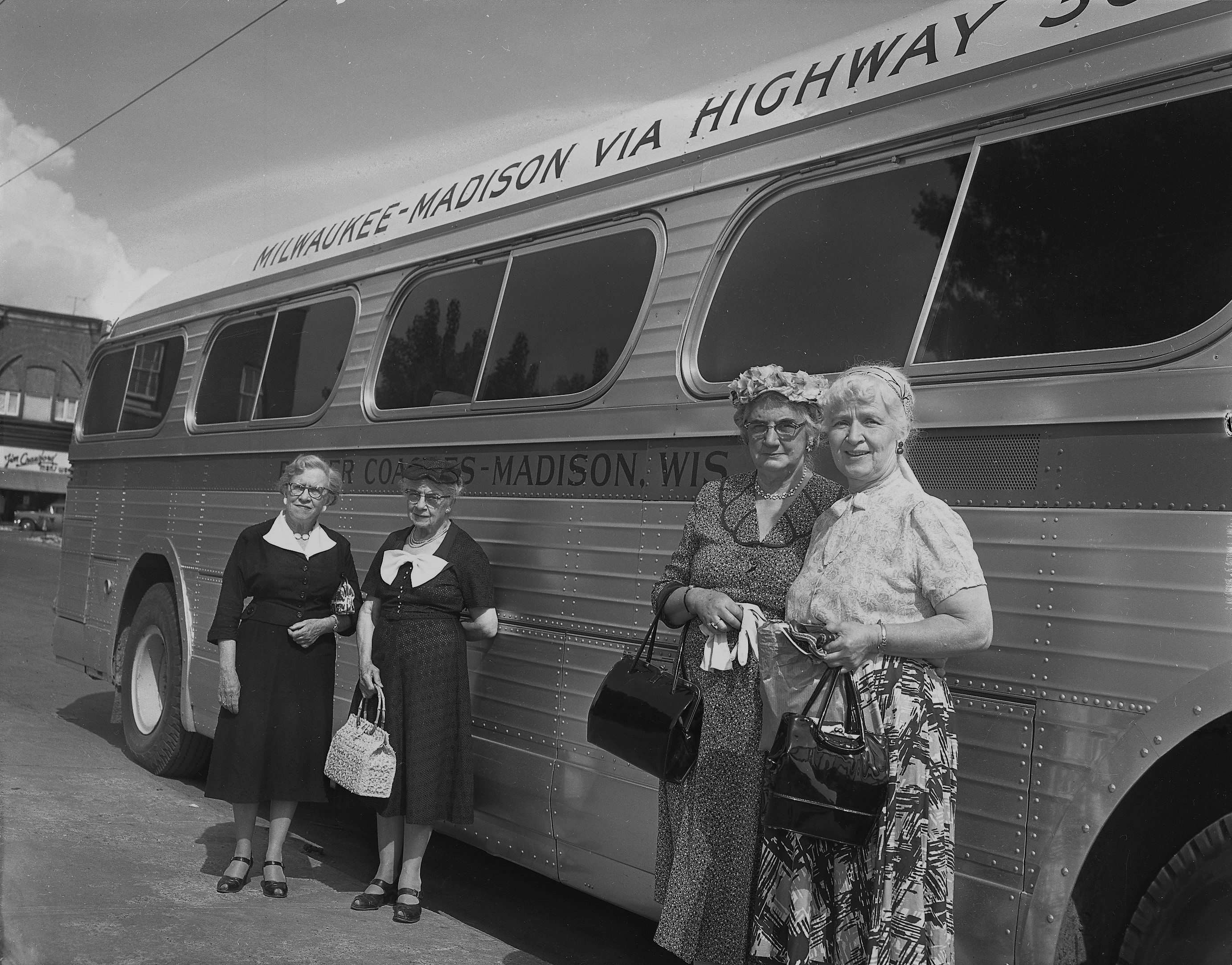 Rosary pilgrimage took 40 residents of Milwaukee, Wisconsin, 680 miles to Martyr’s Shrine near Midland. Among those on the 16-day tour of religious shrines were, left to right, Irene Strong, Anna Strong, Laura Meyer and Emma Drost, on a shopping tour in Midland. They left here Tuesday morning for Ottawa, Montreal, and Quebec.