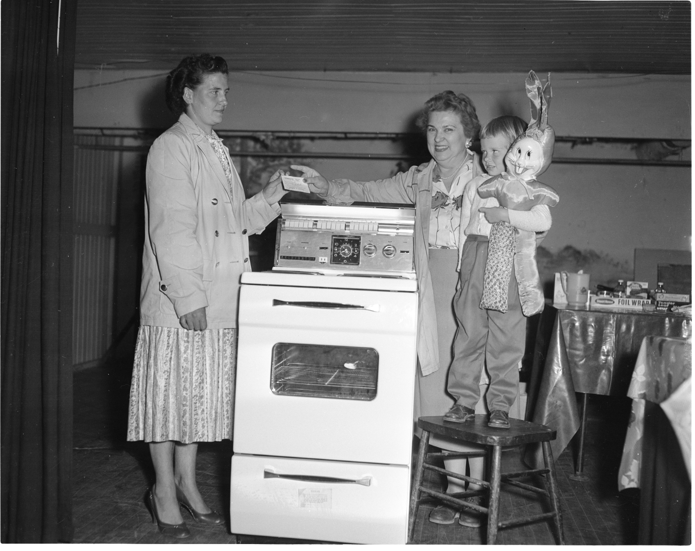 Happiest woman in town as the cooking school sponsored by Dominion Stores Ltd., and Barber and Haskill in St. Margaret’s parish hall ended last week, undoubtedly was Mrs. Frank Bath, Charles Street. Ticket bearing Mrs. Bath’s name was picked from the box by Gail Scott, the 5-year-old daughter of Mr. and Mrs. Frank Scott, and now Mrs. Bath is the proud owner of the brand new electric-stove pictured above. With Mrs. Bath and Gail is Adele Hunt home economist for Dominion Stores.