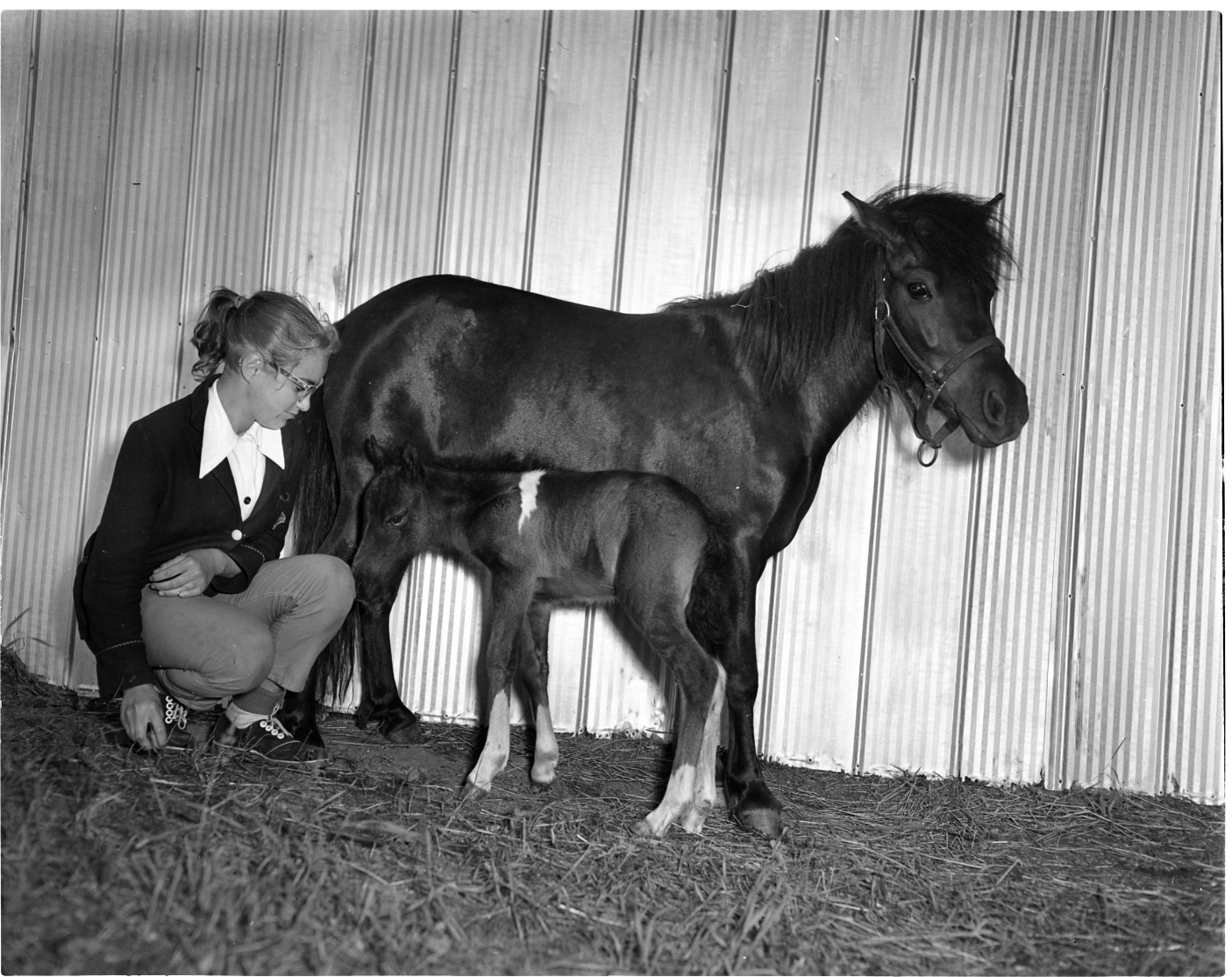 Tiny colt born at Little Lake Park last Thursday is admired by Margaret Jackson, 13. The colt weighed less than 20 pounds and was 22 inches high. The owner is Edgar Lawson. Lawson operated pony rides in the park.