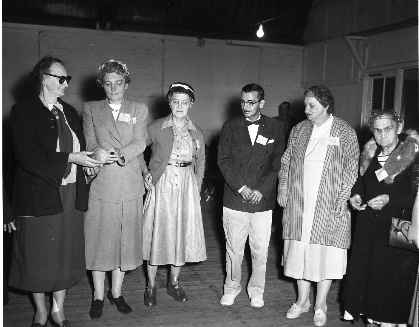 Despite the loss of their sight, these guests at the CNIB picnic in Midland last week still had fun in games specially designed for them. This one is a simple pass-the-ball contest, with the person holding the ball being eliminated when a whistle blew. Rain drove the picnickers indoors from their usual spot at Little Lake Park. More than 140 blind persons from various Simcoe County points attended the event.