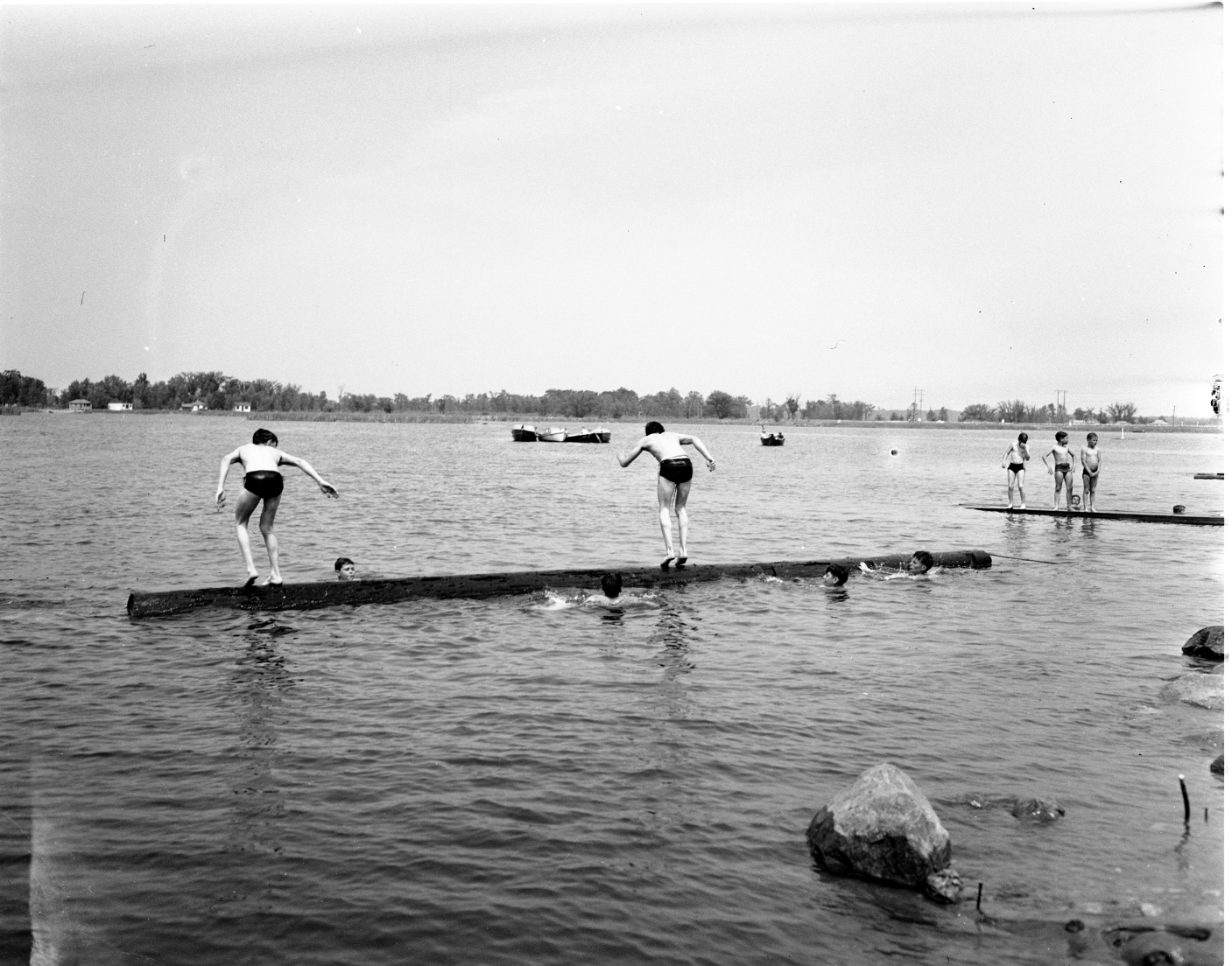 Motorboat races and log rolling contests were among the main attractions at Waubaushene’s annual regatta on the holiday. Mike Basic, Toronto, was a big winner in the motorboat races. Bare feet and a slippery log posed quite a problem for these youthful log rollers.