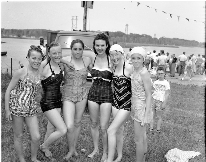 Bubbling over with good health and good spirits, these girls were prize winners in the swims held in connection with the Waubaushene regatta Tuesday. Left to right are Jackie Moreau, Laurie Wilson and Audrey Somers, all of Waubaushene, Helen Richardson, Toronto, Gail and Sharlene Bell, Thistletown. A few minutes after this picture was taken, Audrey stepped on a fish hook.