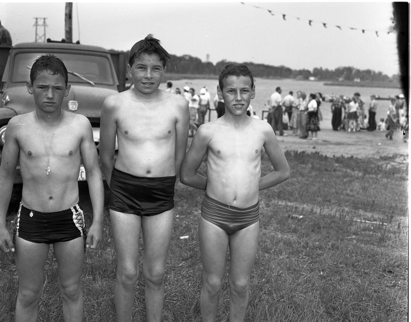 The annual regatta at Waubaushene attracted a good turn-out of both spectators and competitors on the holiday. Winners of the boys’ swims, seen above left to right, are Ralph Barron, Wayne Jickells, and Roger Wood. Wayne is a Niagara Falls visitor.