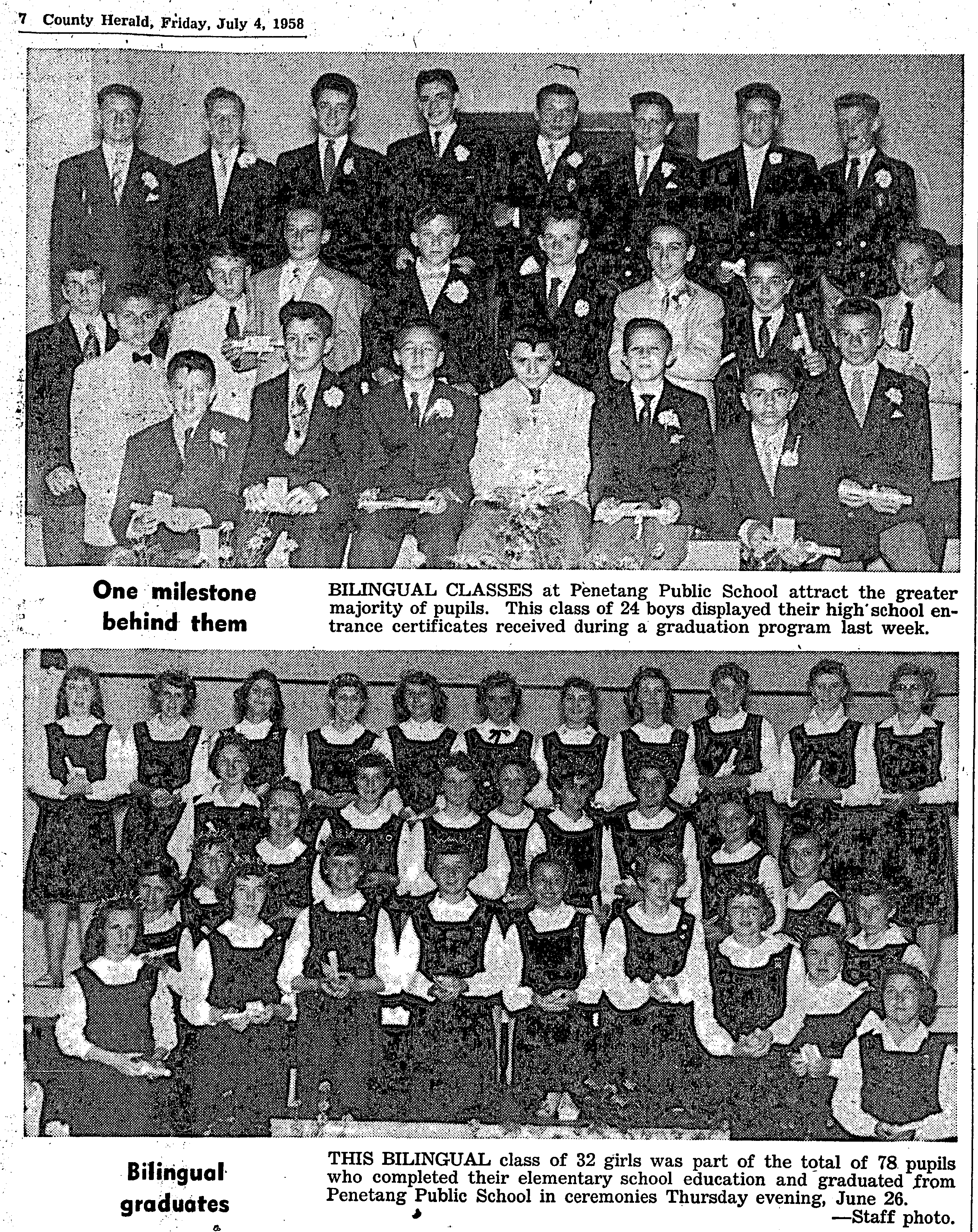 - (Promotion lists were published in this paper for all area schools including rural schools in Tiny and Tay and Sacred Heart in Midland, but many of the pages are damaged. This is my kindergarten class at Regent.) Kindergarten A to 1 Morning Class—Jane Adams, Susan Andrews, Edward Bath, Barbara Benson, Sharon Brooks, David Clark, Joy Cudmore, Terry Diver, Judy Duncan, Stewart Duncan, Dona Galivan, Henry Gallong (I believe it should be Gollong), Susan Hallyburton, Steven Hassell, Jimmie Holden, Edwin Hornsby, Barbara Jean Hudson, John Levack, Brian Mcllravey, Ruth Moore, Harvey Moreau, Stephen Schleihauf, Deborah Smith, Barbara Spence, Billie Spiker, Diane Valliear, Mary Anne Wilson. Afternoon class — Tommy Barber, Gary Brabant, Barbara Campbell, Sheila Child, Katherine Cornell, Danny Edwards, Joseph Harpell, Debbie Heels, Patricia Henry, Marilene Hentzelt, Linda Hopkins, Steven Irvine, Timothy Irvine, Sheila Johnston, Mary Jane Jory, Olile Lacey, Dennis Langridge, Laurel LePage, George Ligowski, Patricia Moreau, Alan Puddicombe, Beatrix Schaefer, Judy Smith, Donnie Stacey, Terry Taylor, Mark Wilcox. Kindergarten B to 1 Patsy Beatty, Sharon Biggar, Bobby Brodeur, Connie Butson, Stuart Cardwell, Jimmy Caston, Stephen Condren, Anne Cummings, Linda Dempsey, Bobby Frame, Freddy Franz, Virginia Fuller, Hugh Gair, Lynn Gray, Stephen Leclair, Randy Lediard, Jane McLean, Donna Mclntaggart, Randy Monckton, Andrew Puddicombe, Susan Rodgers, Bori Shushan, Janice Smith, Patsy Smith, Jimmy Stacey, Leslie White.