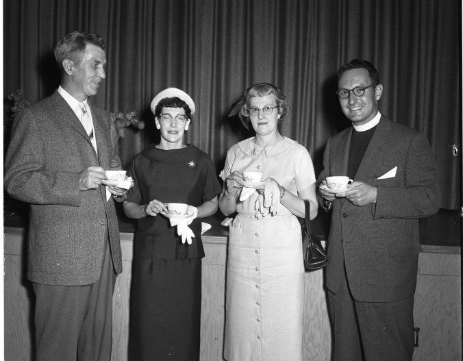 Formalities of his induction as minister of Midland’s St. Paul’s United Church behind him, Rev. Wilson Morden enjoys a cup of tea with J. W. Smith, Mrs. Morden, and Mrs. T. M. McCullough. Despite the hot July night, there was a good turn-out of St. Paul’s members and visitors from other Midland congregations present to welcome the successor to Rev. W. R. Auld.
