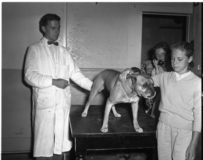Seems that dogs, even as kiddies, must have their “shots” these days, and Sandy was one of the larger specimens that turned up in Midland Wednesday for his anti-rabies vaccination. Elaine Stainton lends moral support, with Dr. T. L. Dale on the business end of the needle. Sandy belongs to J. Stephens of Midland.