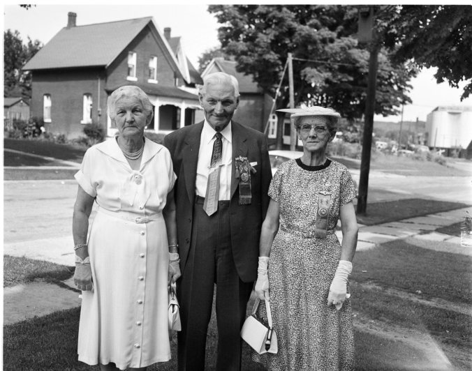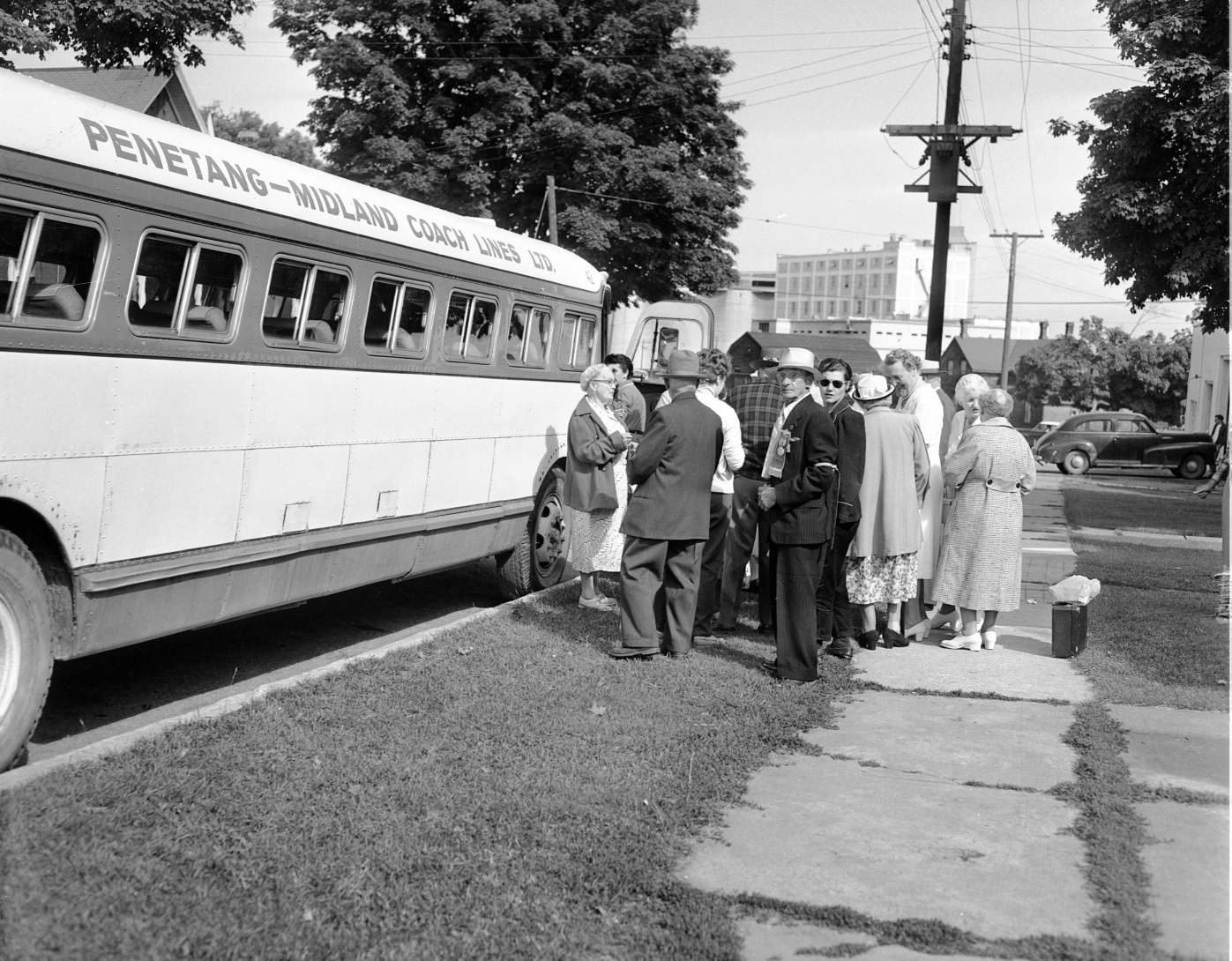 Saturday saw hundreds of North Simcoe Orangemen Collingwood-bound to take in the big July 12 parade. Among the veteran members of Midland lodges who took part were Mr. and Mrs. John Ney and Mrs. Charles Haines, left, in the upper photo. Other members are seen boarding one of several buses for the Collingwood trip.