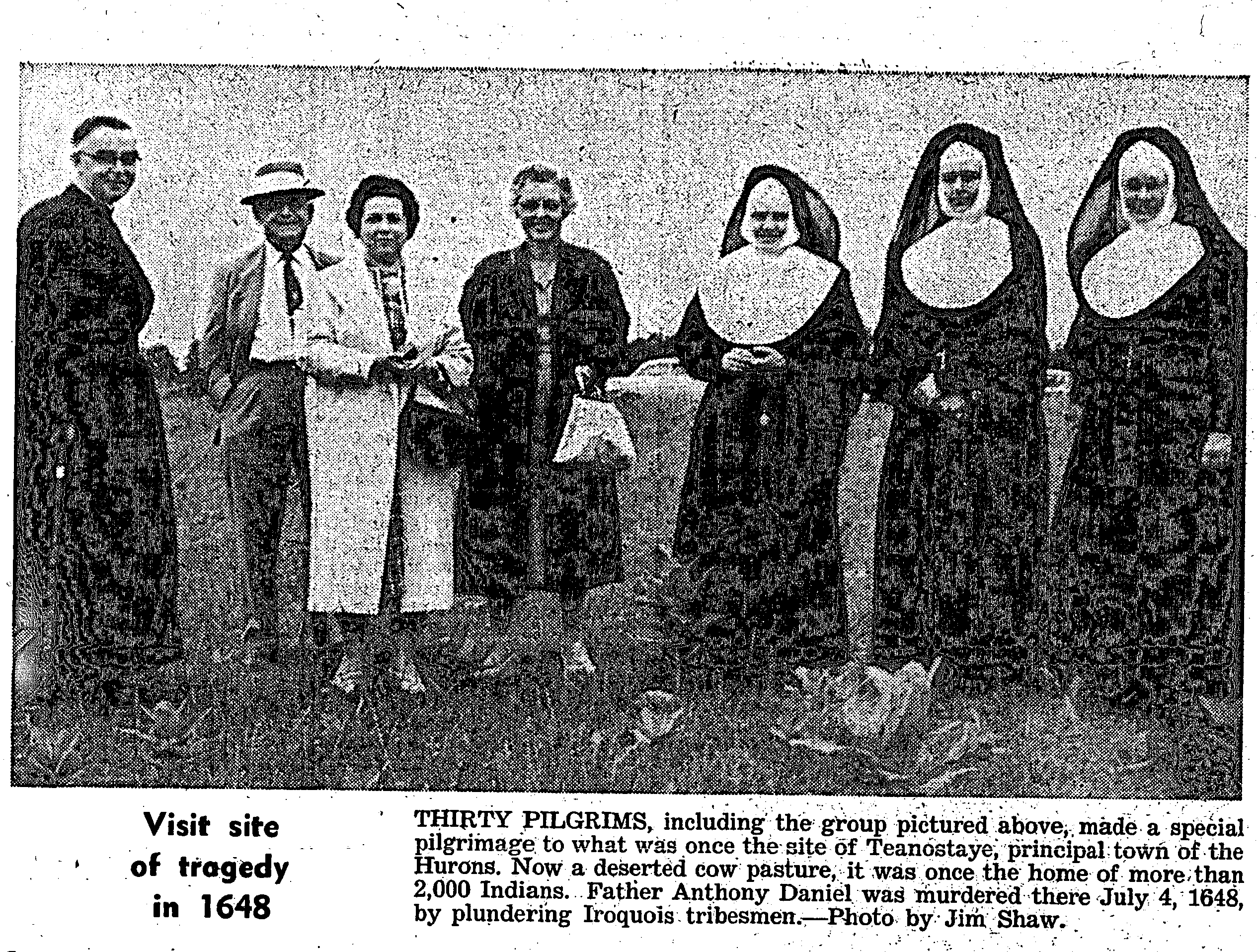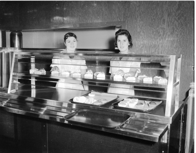 Cafeteria facilities at Martyrs’ Shrine have been greatly improved this year, with sparkling new counter equipment. In lower photo manager Joseph Goetz, right, explains fountain equipment to Fred Cremasco of Guelph, the cashier is Jeanne Sauvé, a brilliant young student from Penetang, now attending U. of T. Setting up wares behind pastry counter, upper photo, are Louise Bellehumeur, Penetang, left, and Marion Lavigne, Midland.