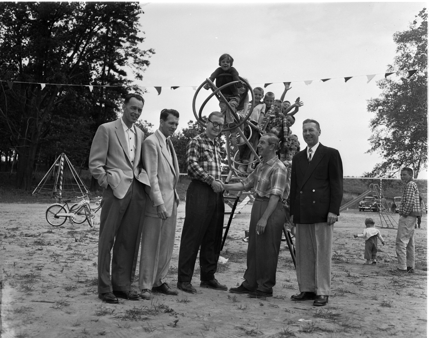 Midland Parks Commission appears to be one step ahead of both the Russians and Americans in space travel. It now has, through the generosity of Midland Y’s Men’s Club, a “manned Sputnik”, shown in the background. In foreground Y’s Men’s Vice-president Cy Ney, Harold Mc Allen, parks superintendent, watch as John Power, chairman of the club’s playground committee, officially turns over the new piece of playground equipment to Wm. Murray, parks commission chairman. At right is Wm. Mutch, Y’s Men’s Club treasurer. Commission hopes other Midland service clubs will emulate the Y’s Men.