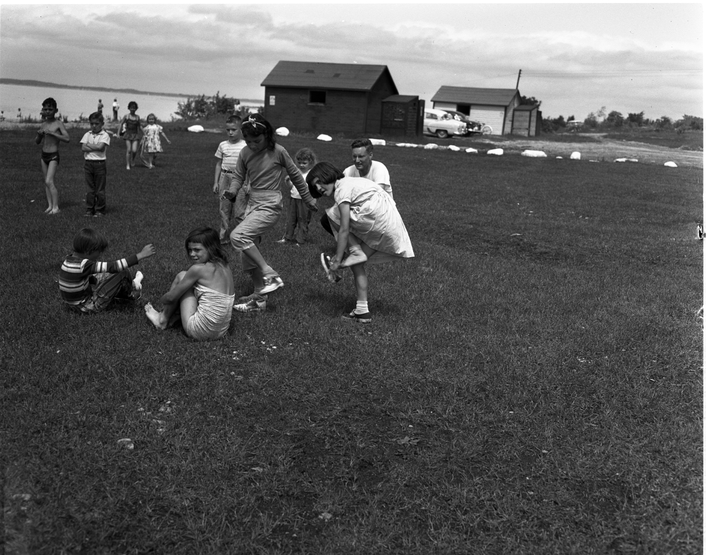 “Where’s my other shoe?”, asked the little girl on the left as she appeals to Father Francis P. Sullivan (right background) for help during a picnic at Paradise Point last week. The picnic was a portion of the program carried on by Sacred Heart Church summer school at Port McNicoll during recent weeks.