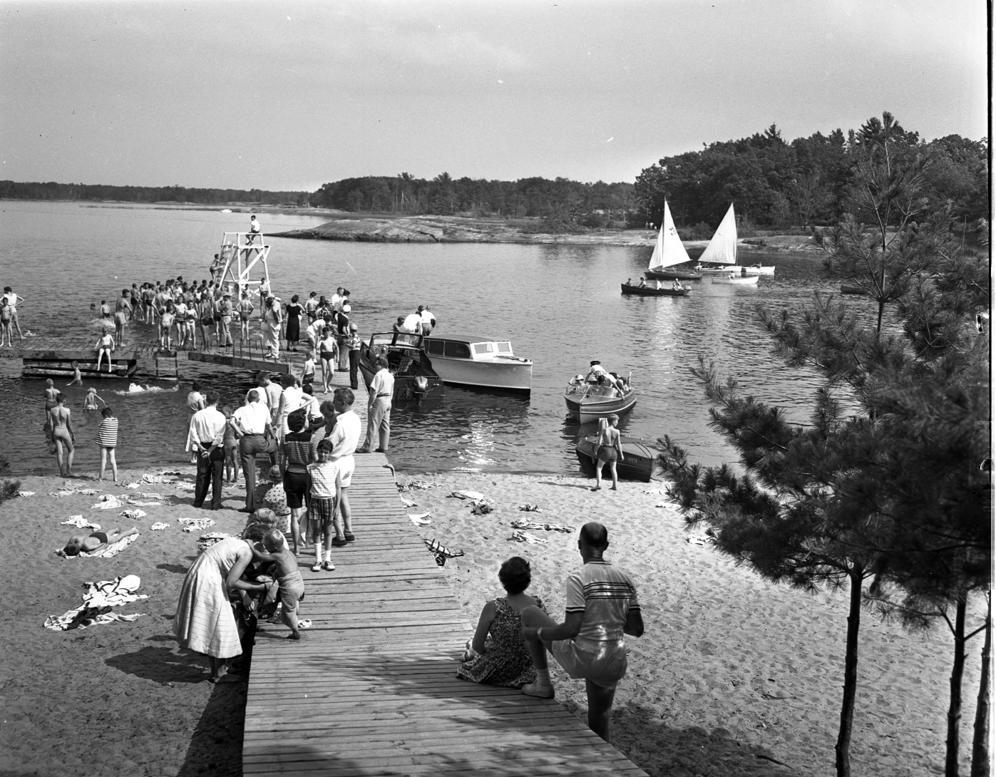 There’s something about the 30,000 Islands of Georgian Bay that’s hard to define or to beat. Seen above is a typical scene at Midland YMCA’s Camp Kitchikewana on a recent visitors’ day. Various forms of entertainment are well illustrated in the picture with swimming, diving, canoeing, rowing, and sailing. Or just sitting in the shade, like the couple in the foreground.