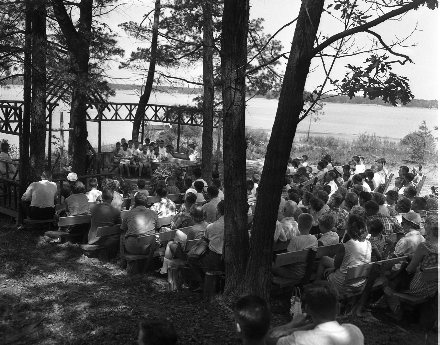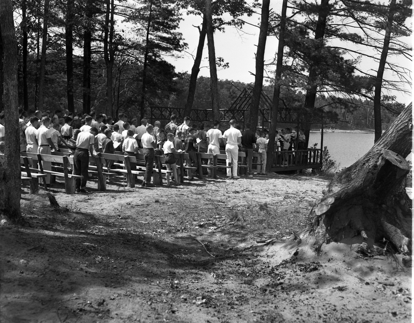 Dedication of the new outdoor chapel at Camp Kitchikewana Sunday, July 13, to the memory of Mr. and Mrs. Norman Playfair was almost like an old boys’ reunion, as dozens of former “Kitchi” members turned out for the event. Rev. Len O’Neil of Leamington, camp chaplain, officiated. A portion of the crowd which attended the dedication service at the new chapel is shown.