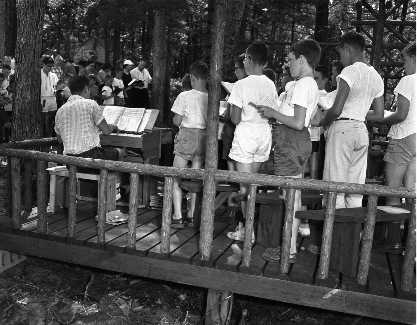 New harmony in camp, this new organ will provide music for the new outdoor chapel dedicated to the memory of Mr. and Mrs. Norman Playfair of Midland at ceremonies held at Camp Kitchikewana July 13. New chapel replaces one destroyed by a storm last year.