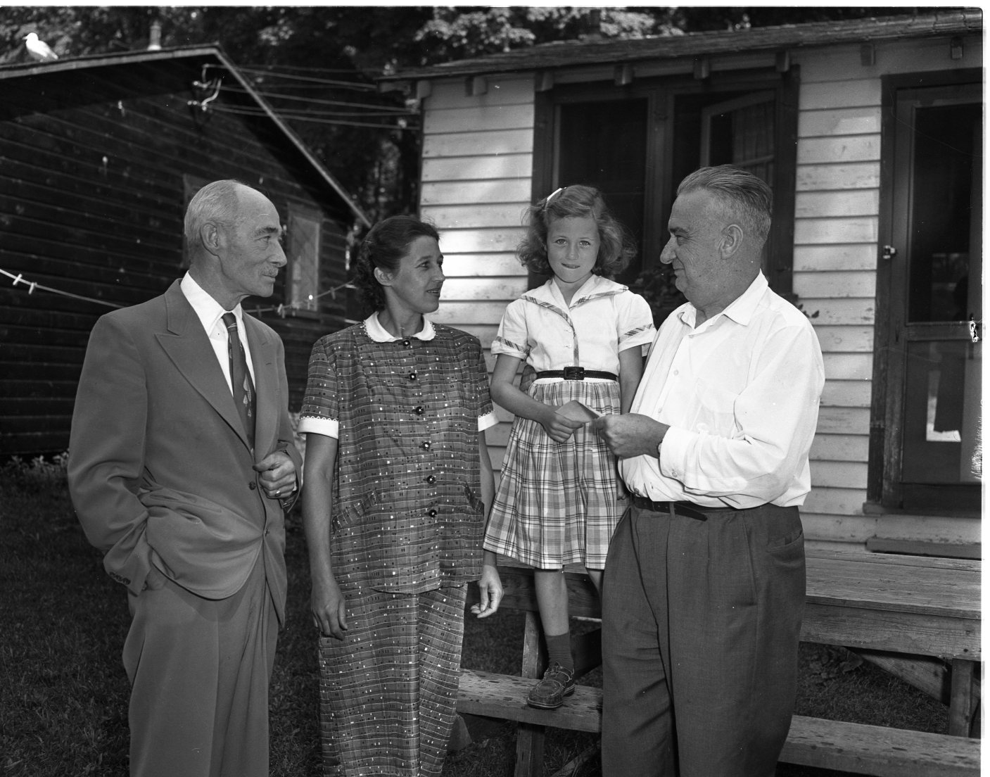 Honesty of a nine-year-old girl from Udney, Ont., was rewarded last week with the presentation of a cheque for $10 by Midland Lions Club officials to Doreen Robertson. Seen with her mother, and Lions Harold Humphries, left and Alex Macintosh, Doreen found $60 entering the Lions bingo at the curling rink last Tuesday. The money was returned to a Midland woman who was also attending the bingo.