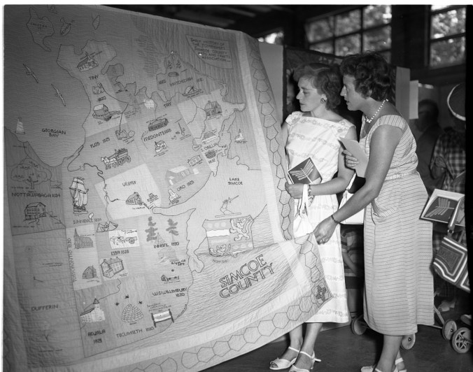 Mrs. John Brownell and Mrs. H. K. Wiese, both of Midland, examine one of the outstanding quilts which were displayed at Simcoe County’s Tenth Annual Quilt and Rug Fair in Midland Armory last week. The quilt depicts early history of the county.