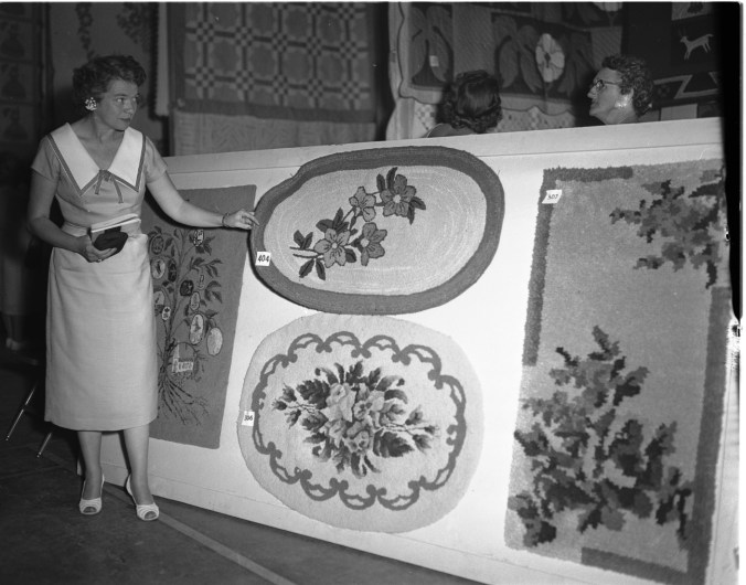 The tenth annual Quilt and Rug Fair; which gets underway at Midland Armory today, promises to be one of the biggest and best in its history. Looking over some of the entries are left to right, Miss Louise Colley of Barrie, Mrs. Frank Spearing of Stayner, vice-chairman of the fair, and Miss Annie Jones, Midland, chairman. Some 150 quilts and 75 rugs, many of them for sale, will be on display.