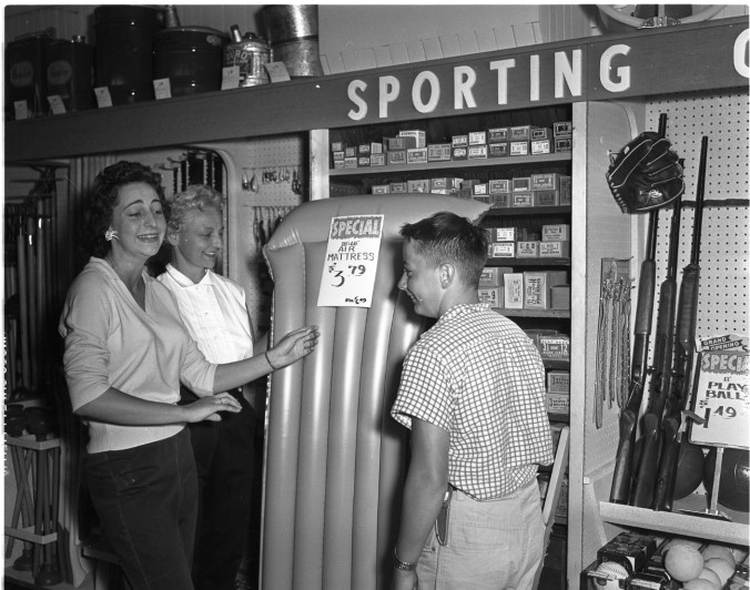 Just the thing for the beach, this air mattress attracted the attention of Mrs. Bergin Evans, daughter Lois, and son Allan, at the official opening of the new Crest Hardware store in Port McNicoll last week. Lennox Vasey, who has been in Port McNicoll since 1924, is the owner-manager of the new store.