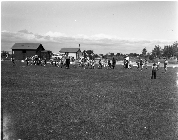 Every year about now the cry goes up “Beat Father Sullivan” as children attending Sacred Heart Church summer school at Port McNicoll hold their annual picnic at Paradise Point. Here the tall, long-legged priest (at left) has his usual long lead over his eager but shorter rivals in the annual race. So far nobody has come up with the obvious solution, of giving Father Sullivan a 20-yard handicap.