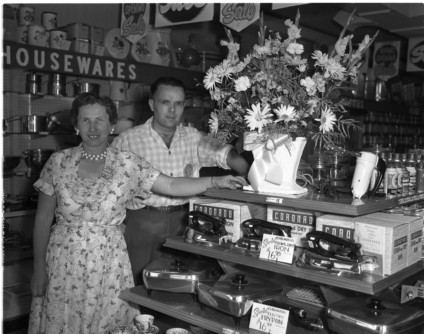 Proud owners and operators of the new Crest hardware store in Port McNicoll, Mr. and Mrs. Lennox Vasey are seen prior to the official opening of the re-modeled store last week. Both have been active in several Port McNicoll organizations for a number of years.