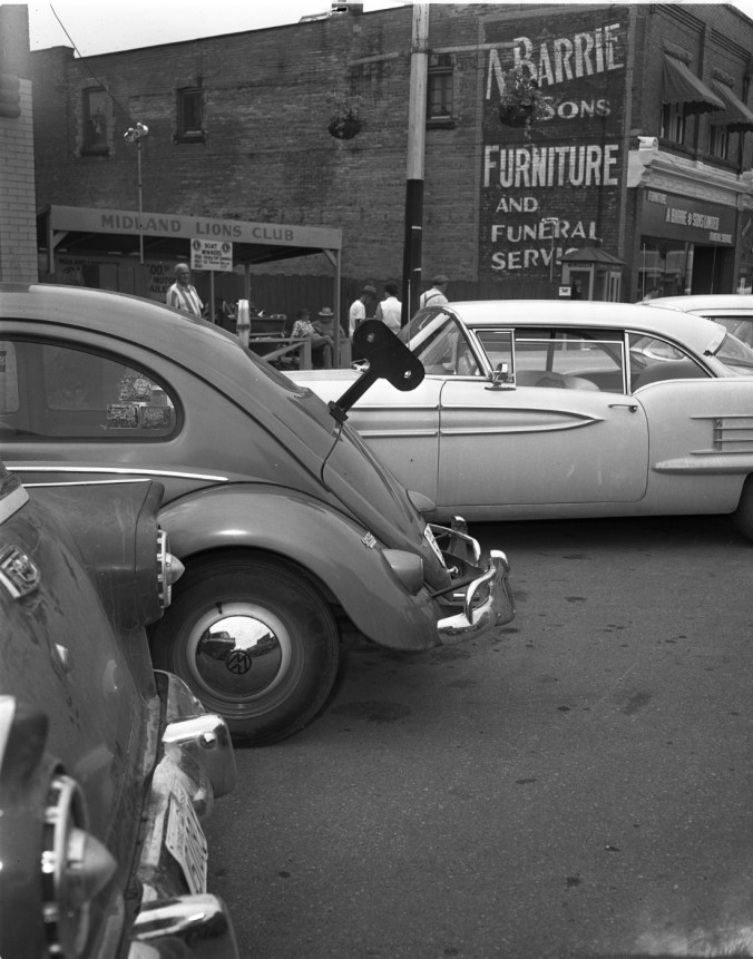 Just wind her up and away she goes. Owner of this small German-made auto parked on Midland’s King Street this week had attached ‘key’ to the vehicle for the amusement of onlookers.