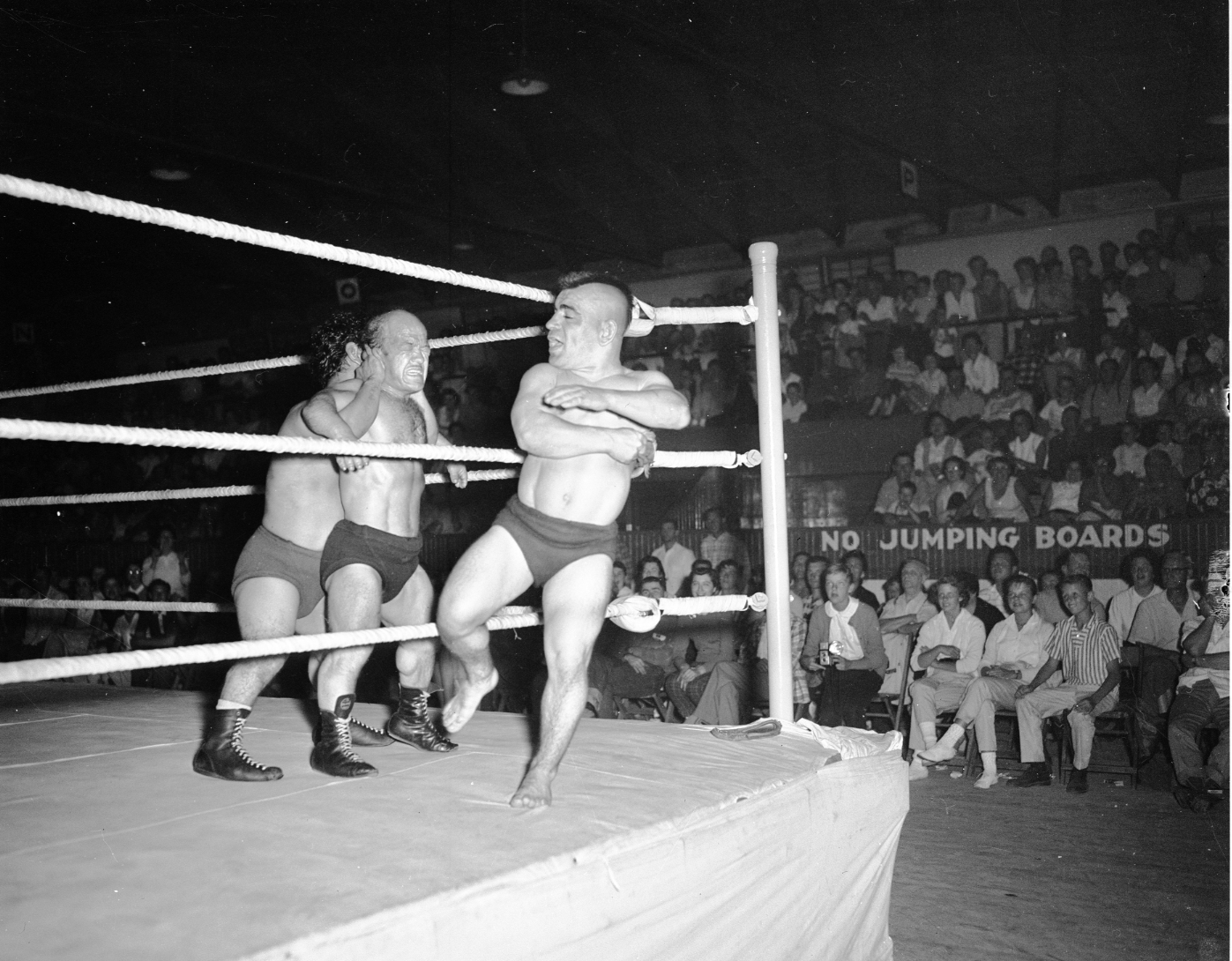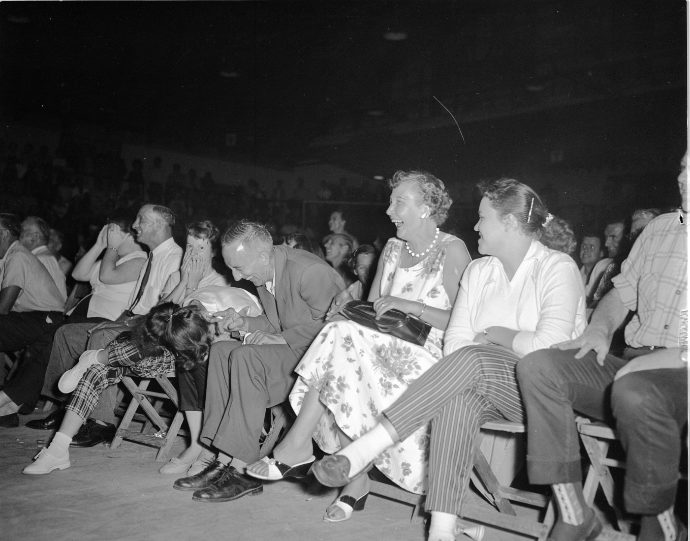 “LAUGH? I thought I’d nearly die!” Always good for plenty of laughs, the midget wrestlers sent some of the 1,769 fans present at Midland Arena Monday night into near convulsions, as witnessed above. Seems like a sure way to relax amid world tensions.