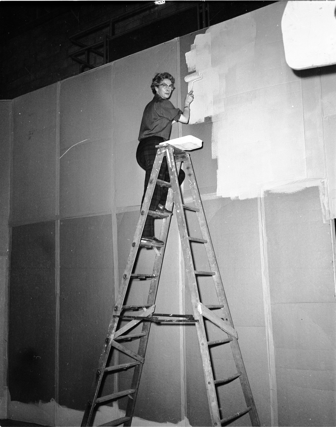Risking life and limb atop a 12-foot ladder for the dear old Simcoe Quilt and Rug Fair was Miss Barbara Cooper of Coldwater. Miss Cooper was one of several women who worked hard to get Midland Armory ready for the 10th annual fair, which started Wednesday and ends at 5 p.m. Saturday.