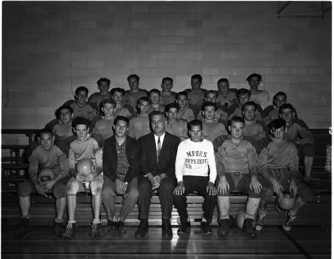 Another good football season looms up for MPDHS teams, with three wins and a tie in four games to date. Seen above is the senior team with, left to right, front row — Dale Smitham, Bill Offord, Venard Quesnelle, manager, Principal L. M. Johnston, coach Doug Swales, Peter Gouett, Paul Bolan; second row — Don Zabzinski, John Richardson, Henry Gouett, Jerry Sibbald, Ken Mackie, Wayne Morrison, Gary Donovan; third row — John Maher, Don Tucker, John Kingsborough, Neil French, John Bell, Wilbur Lamb, Rodney Rankin; fourth row — Marty Reynolds, Bernard Arbour, John Quinlan, John Moreau, Paul McDonald, Paul Dion.