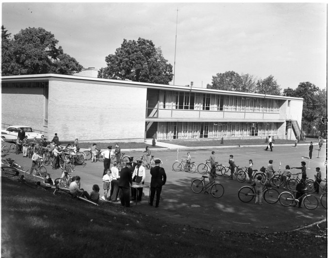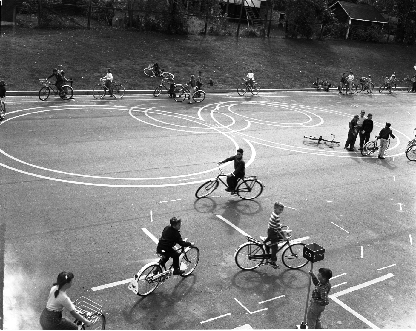 Circles and lines made the parking lot at Midland’s municipal building into a modernistic painting Saturday afternoon, as young bicyclists went through safety tests sponsored by the volunteer fire brigade.