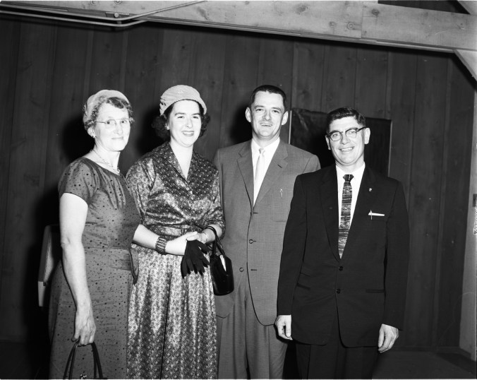 Presentation of a spiritual bouquet to James Cardinal McGuigan was a feature of ceremonies as the cardinal officially blessed the new St. Theresa’s High School in Midland Friday. The presentation was made on behalf of the pupils by Brenda Deschamp and Paul Tremblay. Seated left to right are Monsignor J. M. Castex, Penetang; Cardinal McGuigan; and Rev. R. Egan, Midland.