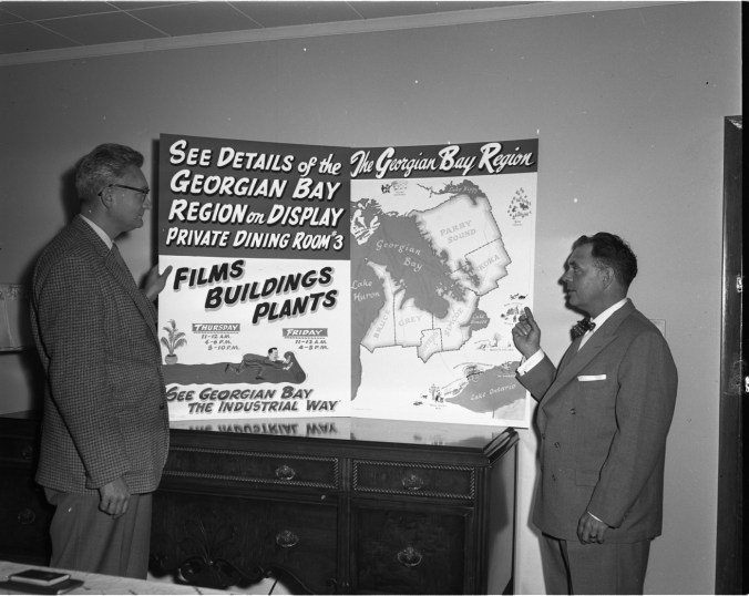 When the Ontario Industrial Development Conference was held in Toronto last week, the Georgian Bay Development Association literally “stole the show” on the other regions present. W. H. Cranston, secretary-treasurer, left, and W. N. Keefe, general manager, look over two of the many posters that startled delegates from less wide-awake areas of the province.